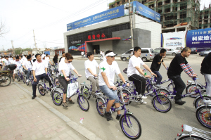 在低碳志愿者骑车聚集到新天地购物公园后,上午10点,自行车拍卖活动正式开始。此次拍卖的是低碳志愿者骑到新天地购物公园的自行车,共19辆。拍卖现场气氛非常火爆,不仅有蔚蓝国际的业主拍得,还有很多市民和新天地购物公园的工作人员积极参与。