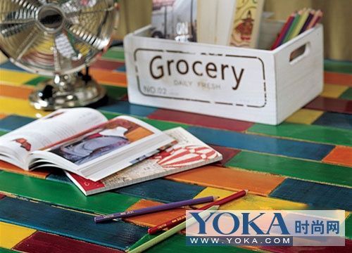 实木桌子,有时是因为外表不时髦而被淘汰,其实结构还是保持完好的。你可以购买价格便宜的木地板,或者使用装修时剩下的材料,试着[FS:PAGE]把它们贴在桌子表面。可以直接用胶粘,中间留些缝隙也没关系,因为木板条可能会根据气候热胀冷缩。最后刷漆上五颜六色的木器漆,就完成了一件非常有创意的作品。