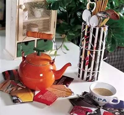 锅垫和盘子垫非常容易弄脏,不论什么材质脏了之后都难清洗。干脆使用废旧的报纸,像叠纸鹤那样,先叠成若干个菱形块,然后用订书钉或者双面胶拼接在一起,就做成了一次性的锅垫和盘子垫。用塑料饮料瓶制成的餐具笼也可以用报纸装饰一下,把报纸搓成小卷,然后依次贴在瓶子上,最后用漂亮的绳子装饰一下即可。