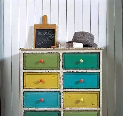 老式的抽屉柜,是上世纪80年代每个家庭的必备。几次搬家都舍不得扔是因为它的确非常好用。无论是在厨房还是在玄关,多个抽屉便于将零碎物品分类收起,找的时候很容易。水曲柳的表面都开裂了,没关系,用白色木器漆整个涂刷,抽屉部分可以按照室内的色彩涂上喜欢的颜色。可以多用几种色彩,用来区分抽屉内部物品的类别。