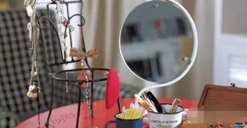 女孩子梳妆台上的物品非常细碎。化妆棉、眼线笔、不用专门购买收纳工具,用过的搪瓷小杯子、木头包装盒都能用。玩具铁艺椅子还能用来放项链等,梳妆台上再也不是一片狼藉。