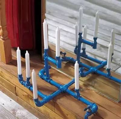 蜡烛并非永远是浪漫的代名词。刚刚装修过,家里剩下了不少水管和弯头,是拿去卖废品,还是自己动手做点什么东西?使用水管拼接而成的蜡烛台,创意味道十足,材料全部来自家中,非常节省费用。可以事先大概画个草图规划一下尺寸和布局,以免造成返工。安装完毕后用鲜亮的油漆涂刷一下,晾干即可。结实的水管蜡烛台,夏天摆在庭院里,非常合适。