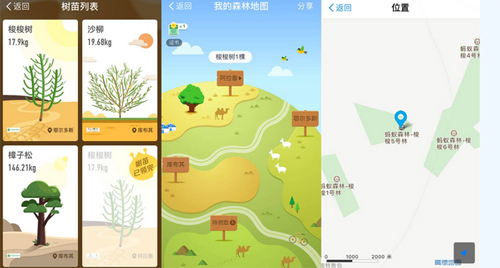 图2:蚂蚁森林的树苗和森林地图,来源于网络