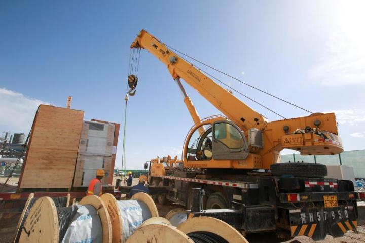 中国能建集团承担常规岛建设任务的的中广核德令哈光热项目。图为电气盘柜吊装。
