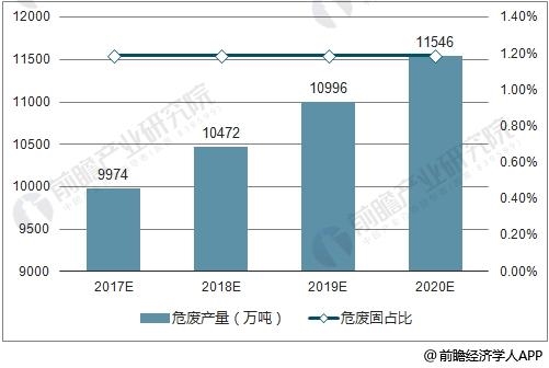 2007年全部工业增加值为11.17万亿元,2007年污染普查固废产量为38.52亿吨,根据此比例假设每亿元工业增加值约带来3.45吨固废,考虑到近年工艺水平及节能降耗能力提升,假设每亿元工业增加值带来3吨固废。假设2018~2020年工业增加值增速为5%,据此得到2020年固废产量预计为9.7亿吨。根据2007年普查数据,危废占固废比例为1.19%。2020年危废产量仍远超过2016年统计值,预计为1.15亿吨。