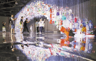 近日,一个由近2万件回收塑料制品组成的装置艺术作品“巨环”在上海科技馆展出。这个艺术作品长17米,通过镜面反射形成圆环造型,表现海洋中废弃塑料形成的“垃圾带”正环绕着我们的现实,提醒人们减少产生和丢弃塑料垃圾。