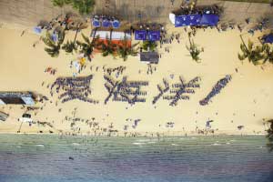 2000名志愿者组成“爱海洋”人字阵,宣传保护海洋。