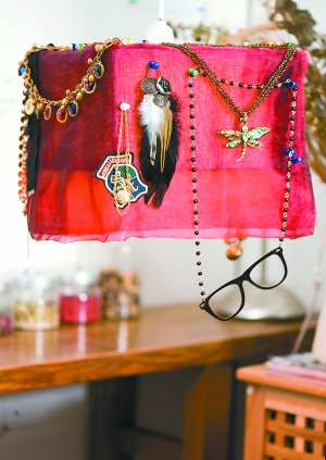 6、完成:虽然漂亮的纱灯已经完工,但DIY创意不会枯竭。实用之外还要更美观,具体做法是将剩下的彩色图钉随心所欲地插在泡沫板上,然后挂上美美的首饰,耳钉、项链等等,越闪亮越好。