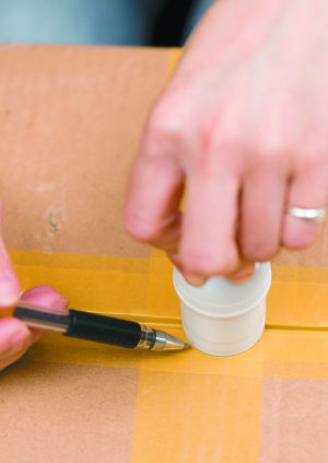 2、挖灯洞:找出纸盒顶部的中心点(如果是正方形的纸盒,可如图所示将剪掉的一边对折,很容易就找到那一点了),按灯座的形状挖一个洞。
