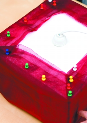 4、裹纱:选择自己喜欢的颜色的透明纱,最好是厚一点的纱,能遮住泡沫板的外观。然后用彩色图钉,将纱固定在泡沫灯罩的四周。