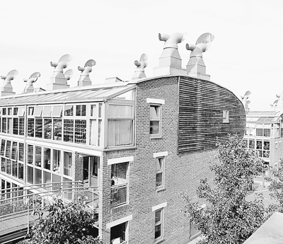 屋顶和地下还有玄机。屋顶是太阳能,提供大楼的电能。地下有沼气池,楼内的有机垃圾全部收集于此,以产生燃气,供居民使用。可以说,这幢楼的电能、水源全部实现了自我循环。