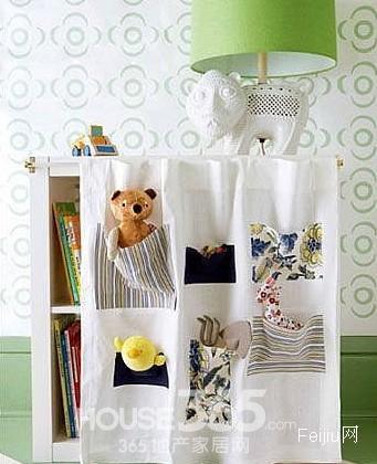 改造方法:现成的较长的布帘剪成合适的长度,挂在书架前挡灰尘。别忘记在帘子正面缝些彩色布口袋,充满乐趣。