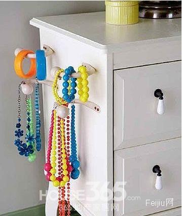 改造方法:将窗帘的系带挂钩固定到梳妆台侧面或衣帽间的墙上,首饰、领带的收纳难题迎刃而解。