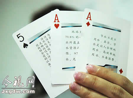 “洗衣水可反复使用。小件衣服最好用手洗,洗衣机洗少量衣服时,水位不要太高。”、“洗餐具最好先用纸把餐具上的油污擦去,用热水洗一遍,最后才用较多的温水或冷水冲洗干净。”……,记者今日了解到,为了宣传节约用水,配合今年5月1日起实施的《南昌市城市供水和节约用水管理条例》,南昌市节水办专门制作了节水宣传扑克牌,扑克牌上有各种节水知识。